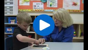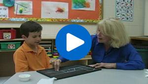 Using the Slate chalkboard, Jan shows Charlie how to form a K with Wet-Dry-Try. The accompanying letter story helps Charlie remember each step.