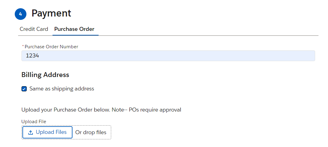 To purchase via purchase order, select the tab in the payment screen. Note, only shoppers at schools and organizations can use purchase orders to check out. If you would like to use a purchase order but do not see this option, please use the purchase order upload here.